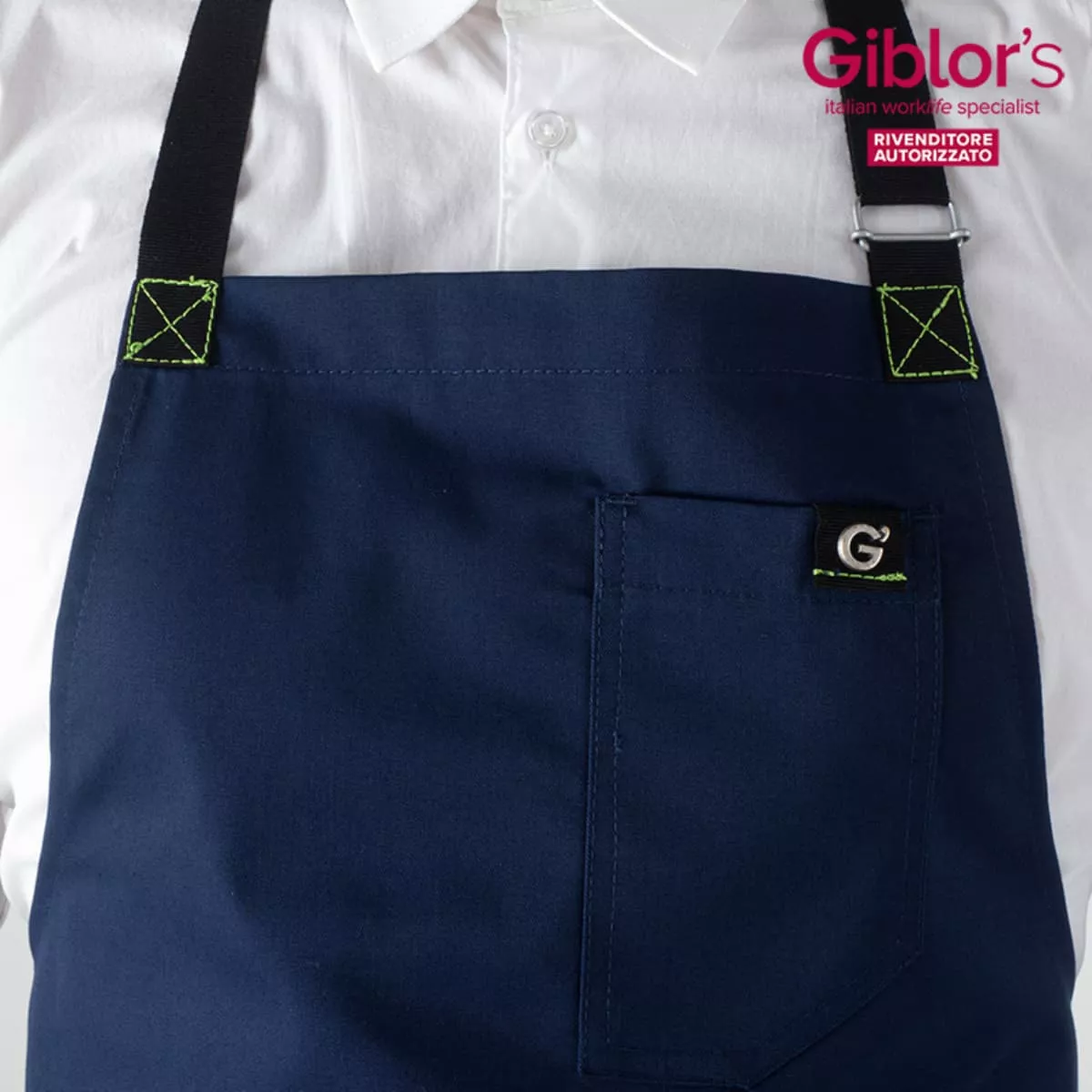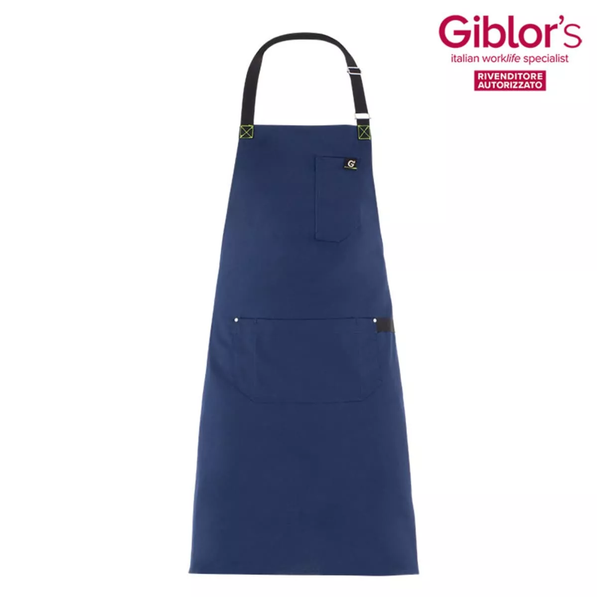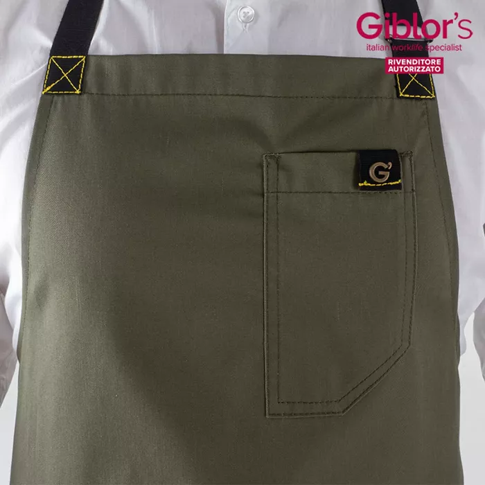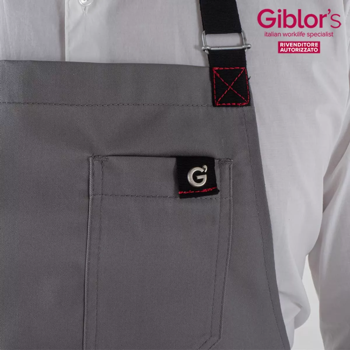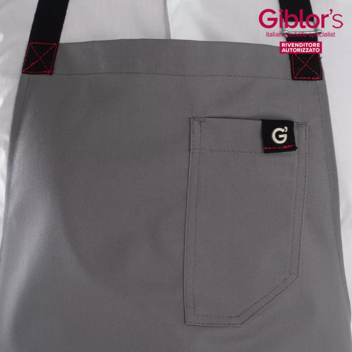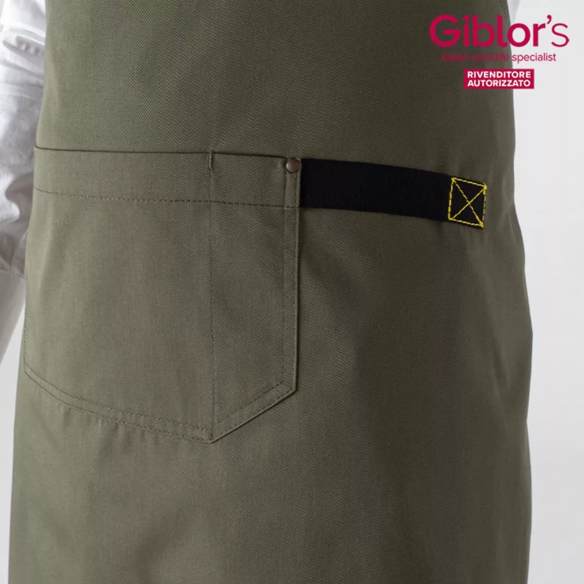 Grembiule Reno Giblor's della G’ Elegance Collection. E' un modello trasversale. Presenta due ampie tasche e i lacci che sono ancorati con travette che rendono il capo ancora piu' resistente.