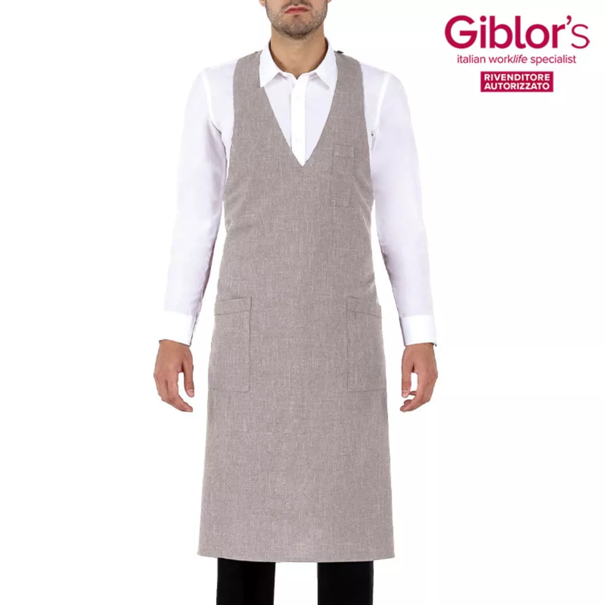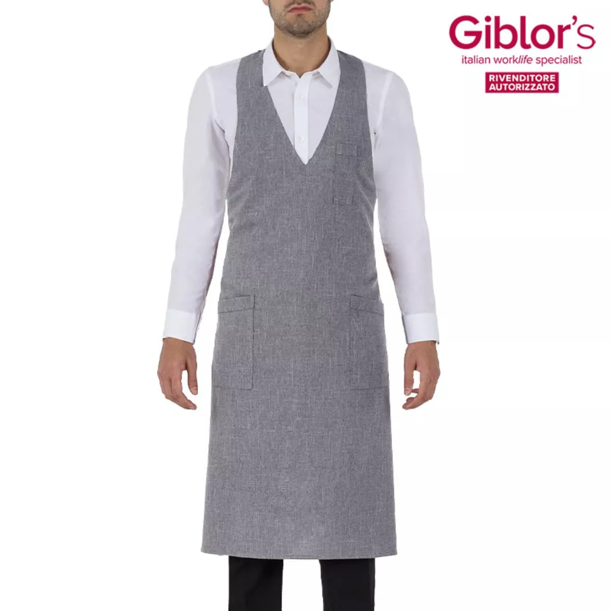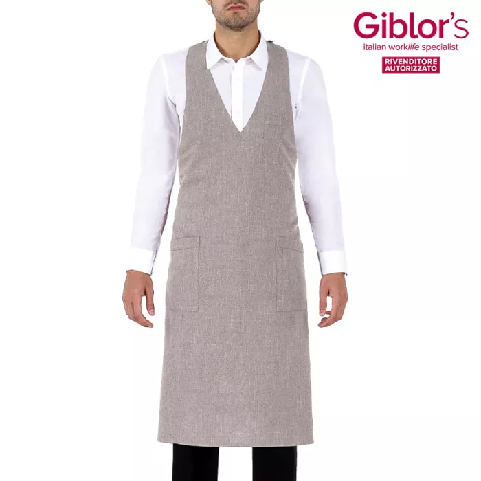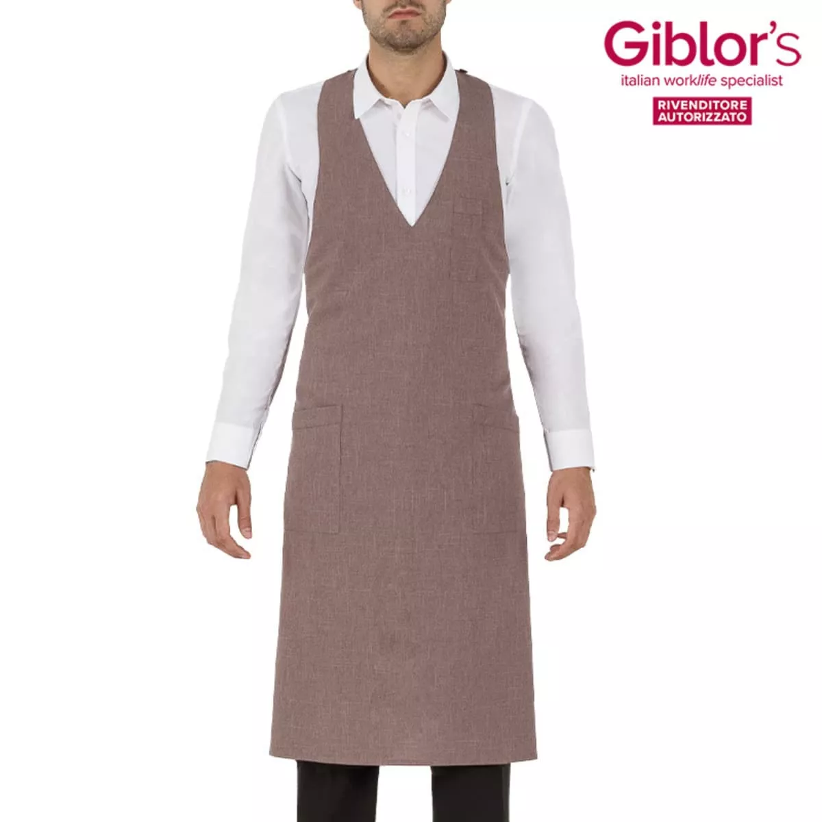 Grembiule Reno Giblor's della G’ Elegance Collection. E' un modello trasversale. Presenta due ampie tasche e i lacci che sono ancorati con travette che rendono il capo ancora piu' resistente.